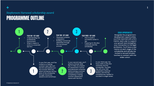Alongside financial support, scholars benefit from a programme of development opportunities, including bespoke Scholar Skills Days, annual Scholars' lunches, and one-to-one mentoring from colleagues at our firm. Scholars also have the opportunity to attend a Training Contract Open Day and are guaranteed a place on a Vacation Scheme, where they will be assessed for a Training Contract with the firm.